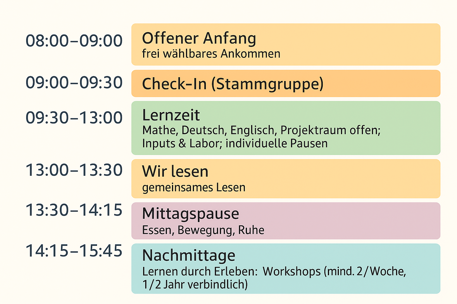 Die Fachräume (Mathe, Deutsch, Englisch, Projekte) sind dauerhaft offen. Parallel finden Inputs, Workshops und Laborzeiten statt.